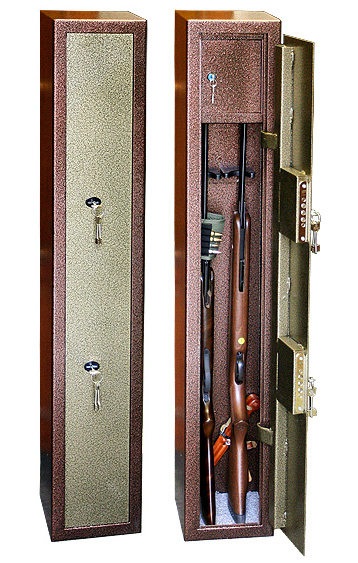 Оружейный сейф ОШ-1 предназначен для хранения оружия и боеприпасов. Сертифицирован на устойчивость к взлому по ГОСТ Р 51113-97 (п 4.1, табл 1а) и соответствует классу взломостойкости Н0 (ниже нулевого). Толщина металла корпуса 2 мм, толщина металла двери 3 мм. Вместимость сейфа 2 ствола. Максимальная высота ствола 1200 мм. Сейф комплектуется патронным отделением, пластмассовыми ложементами. Двери сейфа закрываются 2 ключевыми замками ЗАО Про-Сам г. Рязань или аналогичные замками другого производителя. На задней стенке корпуса расположены отверстия для крепления. Цвет - медь/бронза