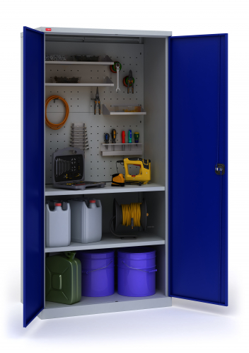 В комплектацию шкафа ИП-1/4 входит: корпус шкафа, двери, 2 полки ИП-1, 2 перфорированных экрана ИП-1, 2 удлиненные полки, 1 укороченная полка, 1 держатель инструмента, 1 держатель ключей, 10 крючков длиной 5см. Шаг перфорации для установки полок 83 мм. Нагрузка на полку - 60 кг, на ящик - 30 кг. Шкаф оборудован ключевым замок повышенной секретности и ригельной системой запирания.
