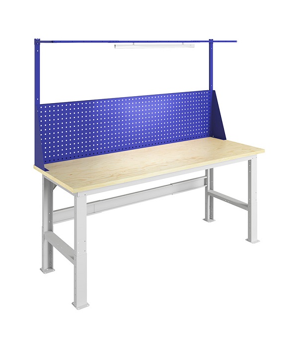 Стол производственный №222 предназначен для организации рабочего места в мастерских, автосервисах, на промышленных предприятиях. Изготовлены из высококачественной стали и отличаются усиленной конструкцией. Стол выдерживает нагрузку 1500 кг. В комплект стола входит: Столешница W-200 мм 1 шт, Опора регулируемая WF-2 2 шт, Планка и косынки WSh 1 шт, Перфорированный экран с косынками 1 шт, Комплект освещения W 1 шт, Усилитель верстака 200. Столешница выполнена из фанеры толщиной 30 мм. Опоры возможно регулировать по высоте от 870 до 1120 мм с шагом 50 мм. Предусмотрена площадка для монтажа комплекта колес WS к опоре. Дополнительно на стол можно установить: подвесную тумбу WD-0; заменить накладку (оцинкованный металл толщиной 1,5 мм или окрашенный металл 3 мм); перфорированный экран; аксессуары для инструментов. Стол производственный поставляется в разобранном виде. Цвет: корпус - серый Ral 7038, столешница не окрашена, экран - синий Ral 5002