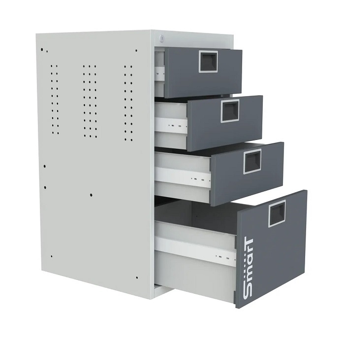 В комплектацию верстака входит: столешница 1760 SMART, тумба SMART 4, тумба SMART 1, тумба-пенал SMART, ящик подвесной Smart-1, один перфорированный экран SMART 1760, комплект косынок для экрана SMART. Столешница выполнена из фанеры 27 мм со стальной окрашенной накладкой 1,2 мм. Тумба SMART 1 комплектуется одной дверью, одной регулируемой по высоте полкой. Тумба SMART-4 комплектуется 4 выдвижными ящиками. Выдвижные ящики оборудованы телескопической системой полного выдвижения ящиков с фиксацией в закрытом состоянии (50000 циклов). Тумба-пенал SMART выдвигается на четырех телескопических направляющих и предназначена для хранения крупногабаритных инструментов и аксессуаров. Ящик подвесной Smart-1 прикручивается под столешницу верстака. Все тумбы закрываются ключевым цилиндровым замком. Секретность замка 2000 комбинаций (2 ключа в комплекте). Внутренние стенки дверей и перфорированный экран имеют универсальную перфорацию для размещения навесных элементов. Шаг квадратной перфорации (10 мм) - 38х38 мм, круглой (7 мм) - 25х38 мм. Возможна смена стороны открывания двери тумбы. Цвет верстака: корпус тумб - серый Ral 7035, столешница, двери тумб, лицевая панель ящиков - антрацит Ral 7016. Поставляется в разобранном виде.