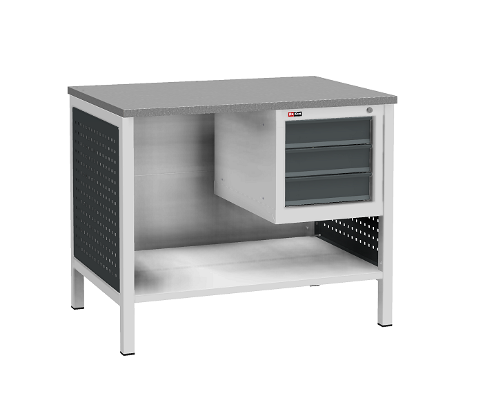 Цвет верстака: серый Ral 7038, панель облицовочная и лицевая панель ящиков/дверей антрацит Ral 7016. Тип покрытия: эпоксидная порошковая краска. Поставляется в разобранном виде