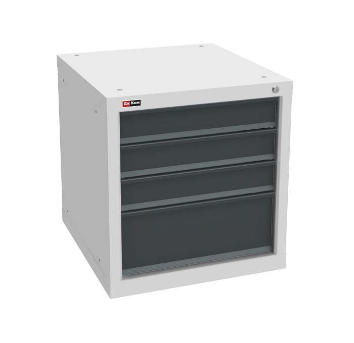 В комплектацию верстака входит: столешница ВЛ-К 100, две опоры ВЛ-К, подвесная тумба ВЛ-К-014, три промежуточные панели ВЛ-К, панель облицовочная к опоре ВЛ-К. Столешница выполнена из фанеры (24 мм) с покрытием из оцинкованного листа металла. Тумба ВЛ-К-014 комплектуется 4 выдвижными ящиками. Полезный размер ящиков (ВхШхГ): 1-80х459х459 мм, 2-180х459х459 мм. Тумба закрывается центральным ключевым замком (50 000 циклов). Опора сварная. Размер опоры (ВхШхГ) - 800х40х660 мм. Промежуточная панель устанавливается между двумя опорами и предназначена для придания жесткости верстаку. Одновременно является задней стенкой или нижней полкой. Панель облицовочная перфорированная устанавливается на опору верстака.