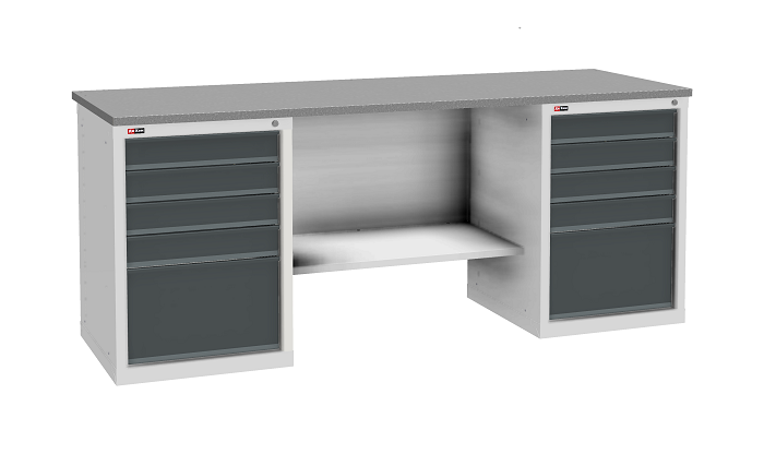 В комплектацию верстака входит: столешница ВЛ-К 200, полка и стенка ВЛ-К, две тумбы ВЛ-К-015. Столешница выполнена из фанеры (24 мм) с покрытием из оцинкованного листа металла. Тумба ВЛ-К-015 комплектуется 5 выдвижными ящиками с телескопическими направляющими. Полезный размер ящиков (ВхШхГ): 1-280х459х459 мм, 4-80х459х459 мм. Тумба закрывается центральным ключевым замком (50 000 циклов).