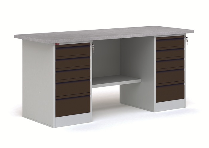 В комплект верстака ВП-6Т/1,6 черный входит: столешница СТ-1,6 из МДФ, покрытая оцинкованным листовым металлом, комплект К-3/1,6 (стенка задняя металлическая), две тумбы Т-2Т с пятью выдвижными ящиками на телескопических направляющих. Тумбы закрываются центральным ключевым замком.